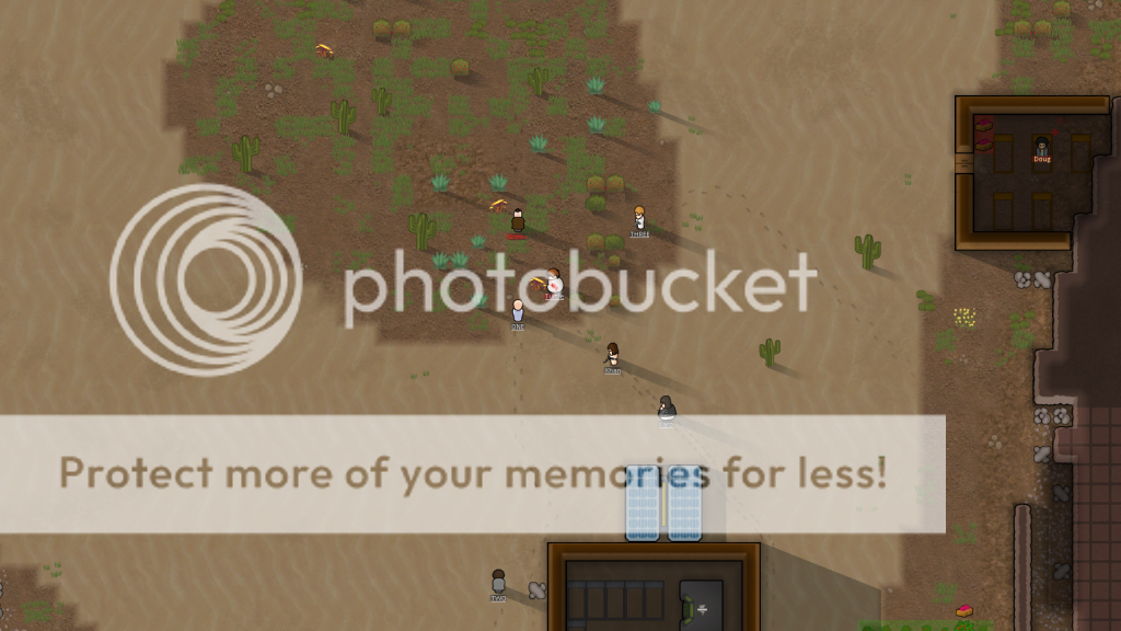 Someone fell out of the sky on a drop pod today. The guy was incapacitated, so someone had to haul his fat ass back to camp. We stuck him in the little storage room we were keeping. I hope he doesn't get into our supply of microsaur feed. We'll really need that stuff when we eventually find microsaurs and tame them as our pets. I really miss Toothy, but I'm sure that I'll find a much better replacement. Having THREE pretend to be a microsaur and do tricks just isn't the same.