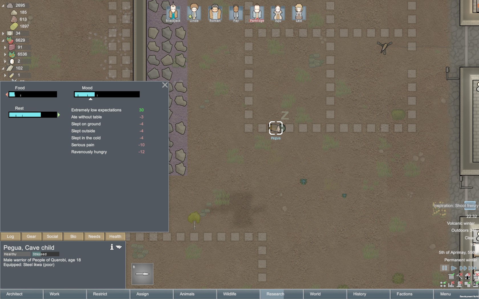 * Re: new traits, Undergrounder doesn't really seem to... do anything. Maybe it's because I don't play mountain bases, but back when I did I remember it pretty much being a non-issue to take a Cabin Fever pawn outside for 10 seconds, problem solved. It is implemented very "flavorfully" by being linked to the backgrounds about mining and living underground, which I like a lot, but the gameplay impact seems to be nil. I also wonder why my Undergrounder pawn is so whiny about darkness, shouldn't she be used to dark places if she grew up in a cave? Regarding pawns who love/hate artificial body parts, I am still very confused about exactly what types of replacement body parts (regular prosthetic-->bionics-->archotech) will affect which types of pawns. Bionics used to be neutral for pawns without traits, but then you added I Never Asked For This, but then removed it? Regular prosthetics are considered "enhanced body parts" by Transhumanists even though they suck worse than flesh? Help, I am so confused. Right now I'm completely avoiding Body Purist pawns because the wording on the trait is so vague that I don't know if, like, saving their life with a regular prosthetic heart will upset them. If that's the case, it might just be the worst trait in the entire game.