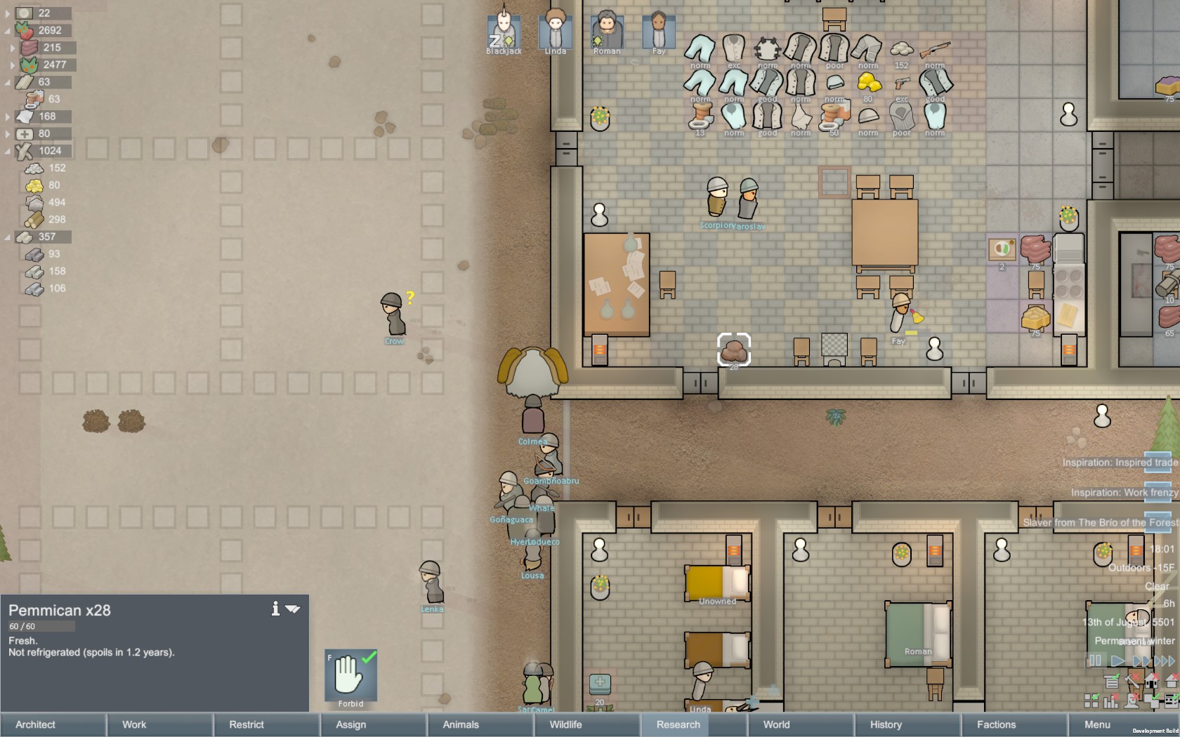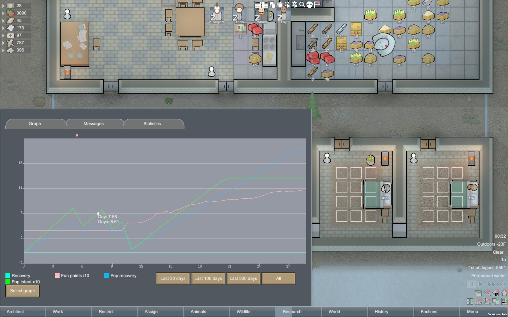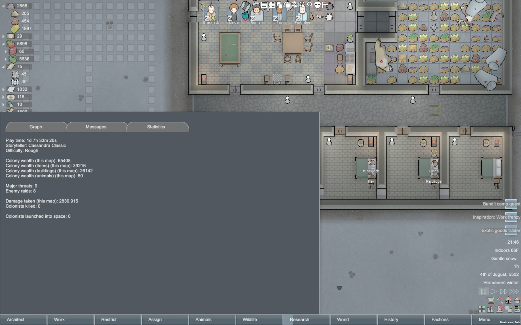 Started a new Crashlanded scenario on the frozen tundra and just like last time I played on tundra, raids stopped once winter set in--and winter sets in very quickly. My grower pawn threw down some giant fields of corn; not sure what the food meta is these days but with just one grower I didn't have the time to be constantly planting and harvesting so long-growing-cycle corn it is. Lucked out with two strong builders and a researcher and managed to get a freezer/kitchen/common room, some nice stone bedrooms, and the solar panels and batteries to heat it all before temperatures dropped (not enough wood on the tundra to burn for power). Also planted cotton to make parkas, which are fantastic for this location now that they don't have the work speed debuff anymore; it's just too cold here for cloth toque + cloth jacket to keep everyone warm. Is there a reason why Crashlanded pawns don't start with synthread jackets anymore? It makes starting in cold biomes harder now. Also I have to say I am missing the old OP wool. Usually the first thing I try to do in a cold biome is tame a Muffalo for those snuggly toques but they don't seem much better than cloth anymore. Two raids of one raider each, one of whom was recruited with relative ease and one who bit the dust after shooting my pawns full of bullets that all missed their intended target. Grr.