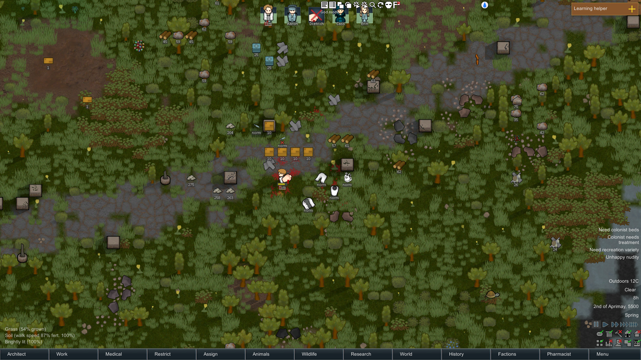 For some reason, any clothes worn by my colonists at the start of the game (pictured includes synththread and hyperweave) turn white when removed (or stripped from corpses). If the dropped clothes are put back on, they remain white. Logs and Mod list attached, plus a screenshot of a test game. The white clothes were originally synthread, but when Tim stripped that corpse, they turned white. I removed his jacket and made him put it back on, but it also turned white.