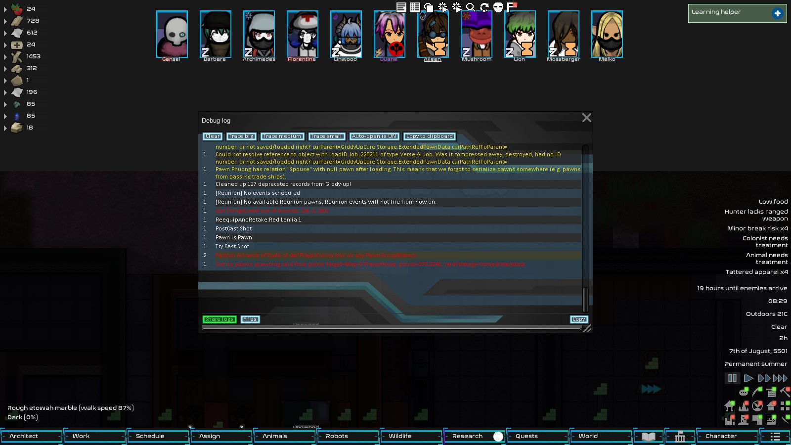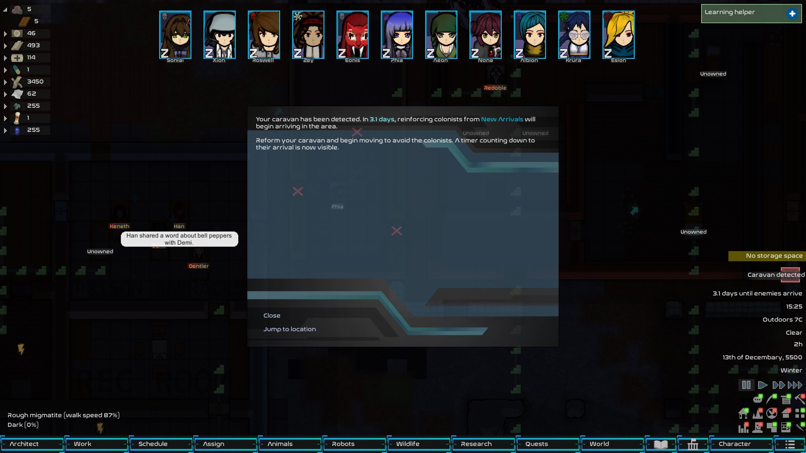 So I got this event where my caravan was detected, even though I never set up one since landing (I have Rimcities and an abandoned city was usually mine to claim. I guess crash landing in a place is considered being in a caravan??). So I gathered my colonists and sent them on an actual caravan (separately because selecting more than 2 colonists causes my game to freeze for a time...). So now everyone is on a different tile, and I'm getting notifications on the enemies arriving (colonists from New Arrivals are attacking?? Isn't my crew "New Arrivals"?). But I'm not seeing any appearing on the map and some reminders of enemy reinforcements were coming up in a row. I got 5 so far, and granted I'm playing on Randy Builder (any higher and my laptop will freeze or restart), I'm not sure if this is a bug, a setting thing, or if I'm supposed to fight off at least one of the raiding parties before taking off on a caravan. I haven't gotten any loading errors, thankfully, so I'm not sure what's supposed to happen. I did look through dev mode and got an error mentioning something about nothing appearing:
